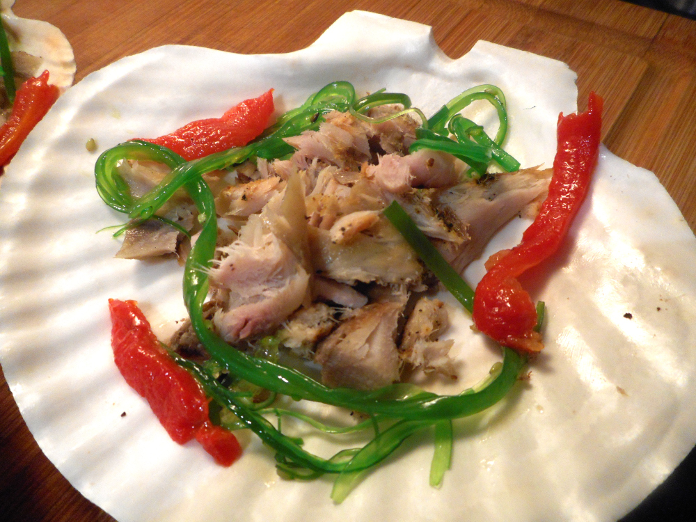 - Prendre le wakamé, les poivrons rouges déjà assaisonnés et à disposer autour (la quantité varie selon vos goûts)