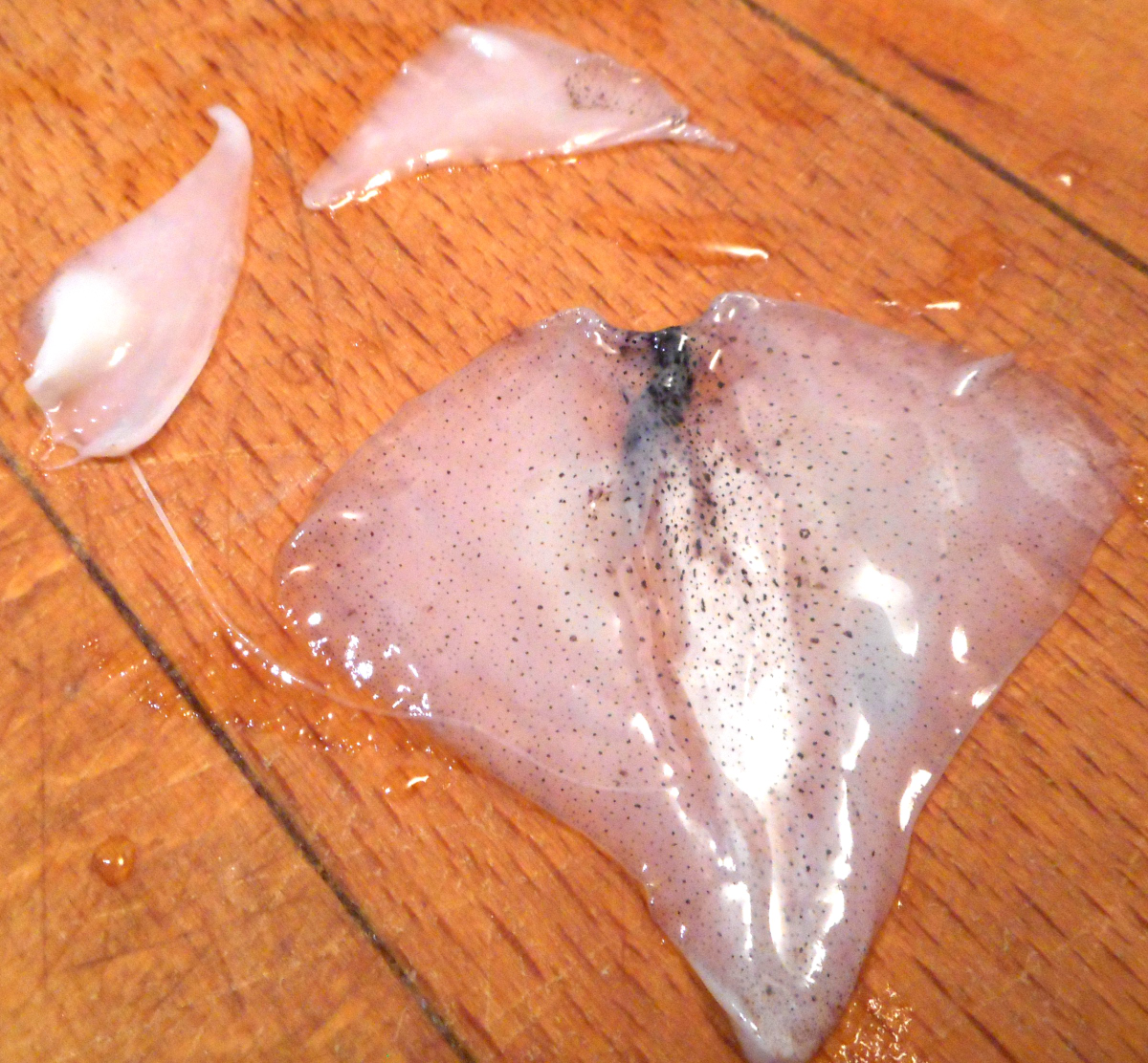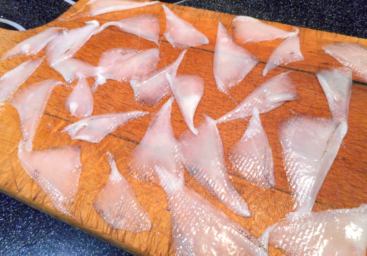 Lorsque je prépare des encornets soit pour la rouille (voir recette), soit pour les farcir, je garde ce que moi j’appelle les « ailes » du tube, mais qui en réalité sont des nageoires.